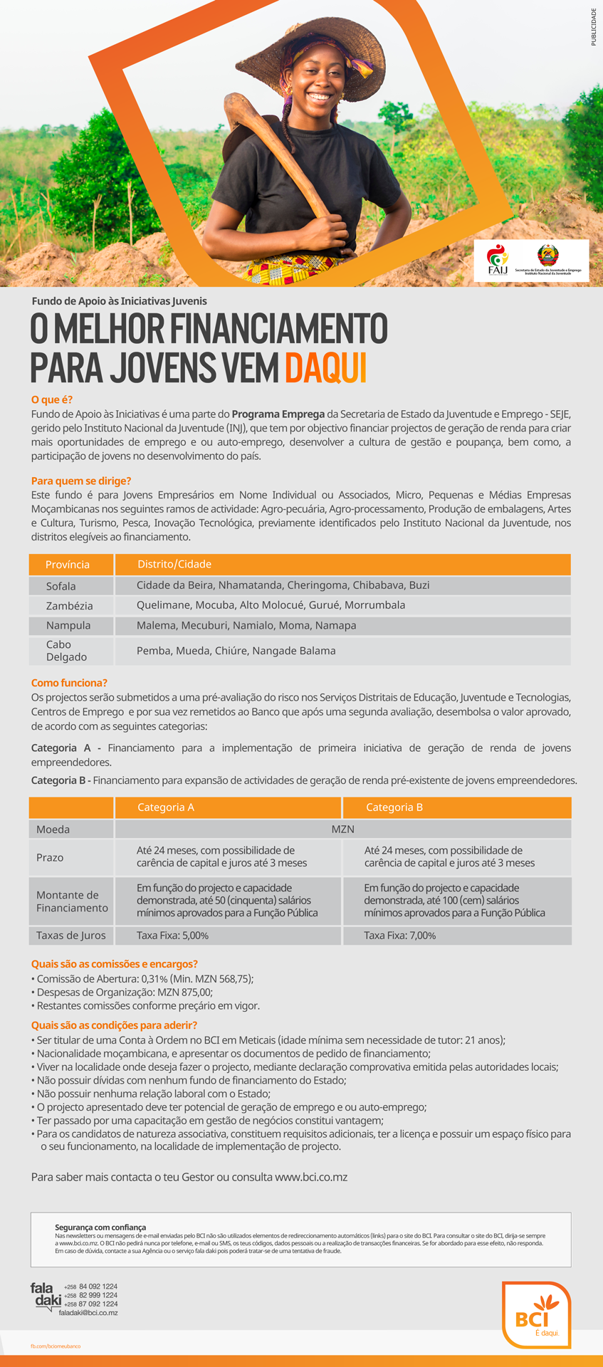 Este fundo é para Jovens Empresários em Nome Individual ou Associados, Micro, Pequenas e Médias Empresas Moçambicanas nos seguintes ramos de actividade: Agro-pecuária, Agro-processamento, Produção de embalagens, Artes e Cultura, Turismo, Pesca, Inovação Tecnológica, previamente identificados pelo Instituto Nacional da Juventude, nos distritos elegíveis ao financiamento.