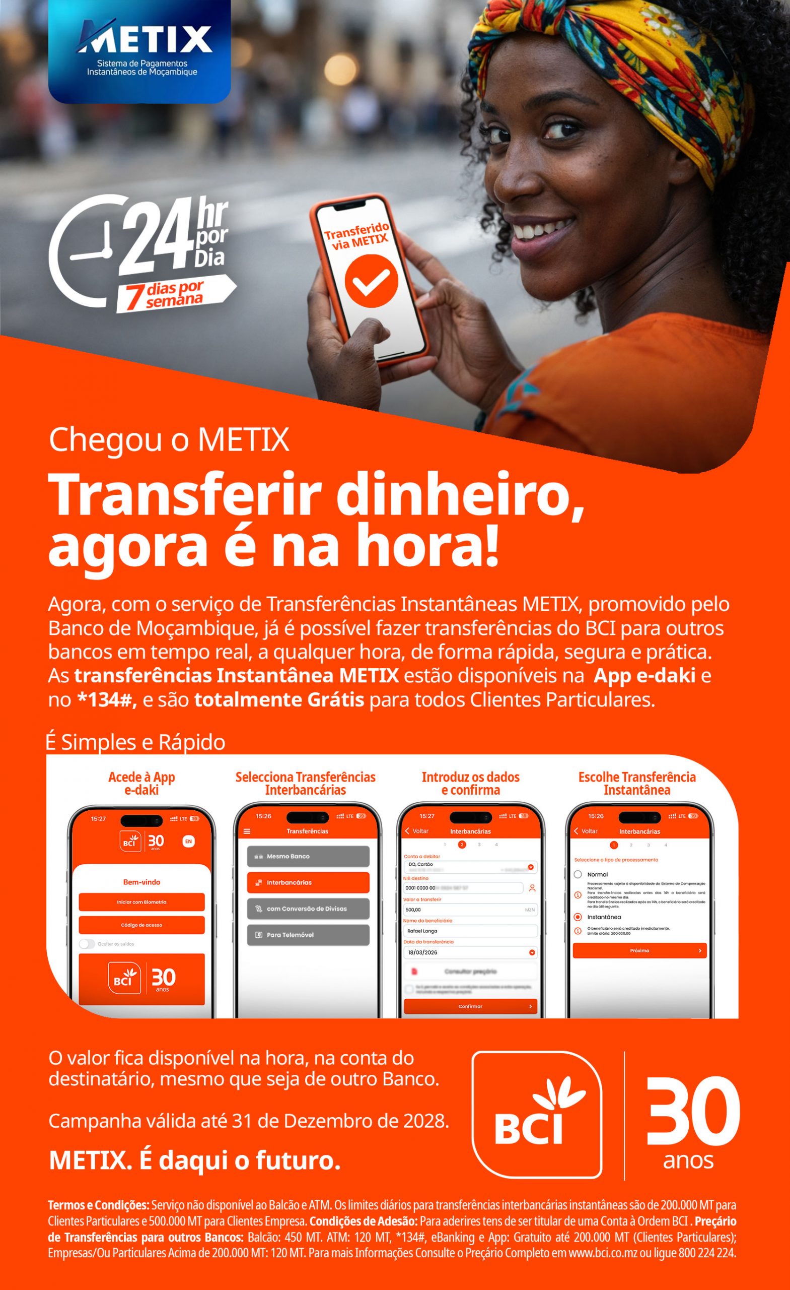 - Fazer transferências até MZN 200.000,00 sem custos, de forma prática e conveniente. Gratuito para Clientes Particulares nos canais digitais do BCI, de acordo com o Preçário – BCI em vigor.